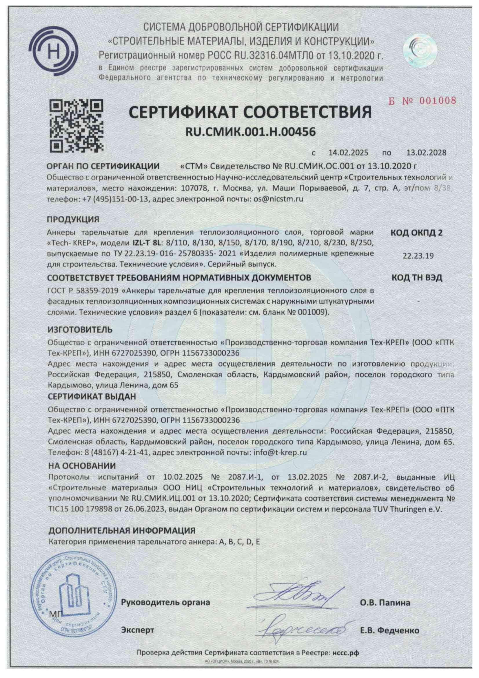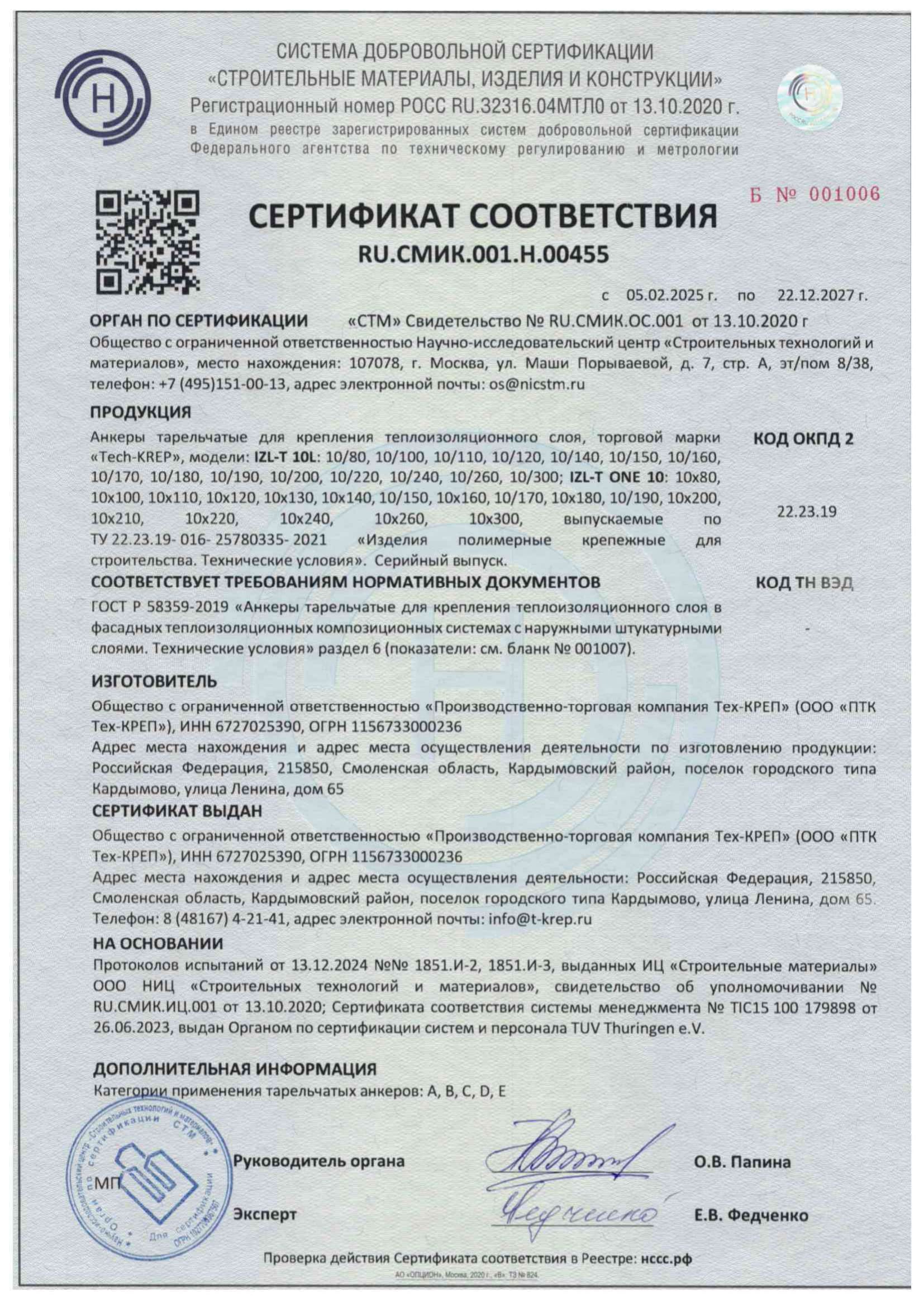 Сертификат соответствия на химические анкера Tech-Krep PE, TIT PE
